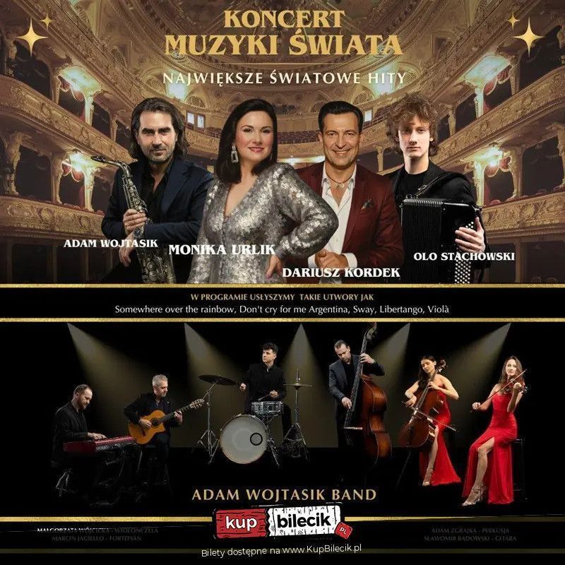 Jedziemy do Was z nowym repertuarem Koncertu Muzyki Świata! Naszą muzyczną podróż zaczynamy w Łodzi by następnie zabrać Państwa muzycznie do Stanów Zjednoczonych, Wielkiej Brytanii, Irlandii, Hiszpanii, Francji, Włoch, oczywiście Polski etc. Wyjątkowe aranżacje Adama Wojtasika perfekcyjnie wykonane przez zespół "Adam Wojtasik Band" Koncert poprowadzi popularny aktor Dariusz Kordek. Nie dosyć, że poprowadzi to także w nim zaśpiewa !!! Do tego wszystkiego niezrównany, wyjątkowo energiczny głos Moniki Urlik. Zwyciężczyni między innymi" Szansy na Sukces" pół finalistka The Voice of Poland zaśpiewa całą gamę znanych i lubianych przebojów estradowych. Nasza Muzyczna podróż dookoła świata zapowiada się genialnie i wyjątkowo!