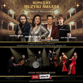 bilety: Jedziemy do Was z nowym repertuarem Koncertu Muzyki Świata! Naszą muzyczną podróż zaczynamy w Łodzi by następnie zabrać Państwa muzycznie do Stanów Zjednoczonych, Wielkiej Brytanii, Irlandii, Hiszpanii, Francji, Włoch, oczywiście Polski etc. Wyjątkowe aranżacje Adama Wojtasika perfekcyjnie wykonane przez zespół "Adam Wojtasik Band" Koncert poprowadzi popularny aktor Dariusz Kordek. Nie dosyć, że poprowadzi to także w nim zaśpiewa !!! Do tego wszystkiego niezrównany, wyjątkowo energiczny głos Moniki Urlik. Zwyciężczyni między innymi" Szansy na Sukces" pół finalistka The Voice of Poland zaśpiewa całą gamę znanych i lubianych przebojów estradowych. Nasza Muzyczna podróż dookoła świata zapowiada się genialnie i wyjątkowo! Koncert Muzyki Świata Monika Urlik & Adam Wojtasik Band artyści: Zespół Adam Wojtasik BandJedziemy do Was z nowym repertuarem Koncertu Muzyki Świata! Naszą muzyczną podróż zaczynamy w Łodzi by następnie zabrać Państwa muzycznie do Stanów Zjednoczonych, Wielkiej Brytanii, Irlandii, Hiszpanii, Francji, Włoch, oczywiście Polski etc.:)Wyjątkowe aranżacje Adama Wojtasika perfekcyjnie wykonane przez zespół „Adam Wojtasik Band” Koncert poprowadzi popularny aktor Dariusz Kordek. Nie dosyć, że poprowadzi to także w nim zaśpiewa !!! Do tego wszystkiego niezrównany, wyjątkowo energiczny głos Moniki Urlik. Zwyciężczyni między innymi„ Szansy na Sukces” pół finalistka The Voice of Poland zaśpiewa całą gamę znanych i lubianych przebojów estradowych. Nasza Muzyczna podróż dookoła świata zapowiada się genialnie i wyjątkowo! Bilety do nabycia na: KupBilecik.pl |